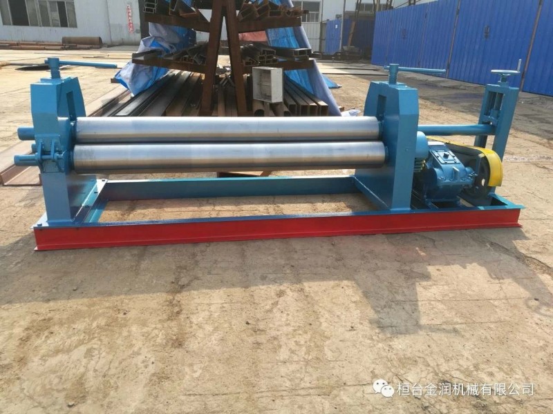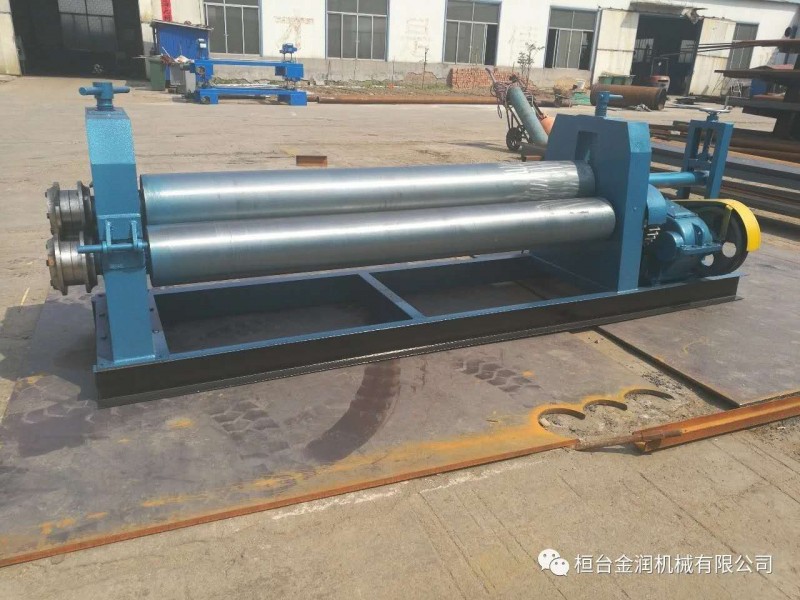 半自動(dòng)卷板機(jī),該機(jī)結(jié)構(gòu)式為三輥對(duì)稱式,上輥在兩下輥中間對(duì)稱位置作垂直升降運(yùn)動(dòng),通過人工擰動(dòng)絲桿使上輥垂直升降,兩下輥?zhàn)餍D(zhuǎn)運(yùn)動(dòng),通過減速機(jī)的輸出齒輪與下輥齒輪嚙合,為卷制板材提供扭矩。上輥可分離取料手動(dòng)升降起輥。